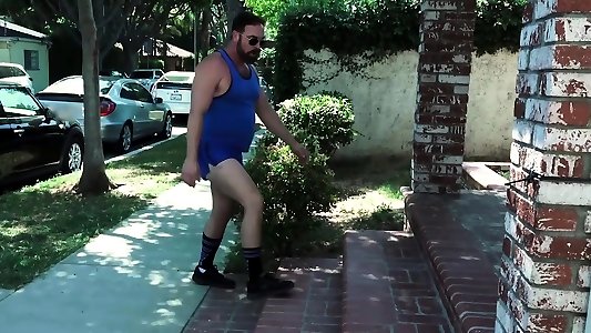 el joven yerno lleva a cuestas su abuelo barbudo y fornido