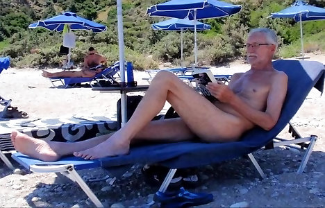 两个成熟的fag家伙有快乐在一个裸体主义者的海滩